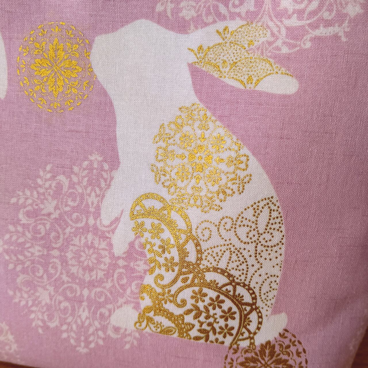 表布はピンク地に白いうさぎ。ゴールドのラメでレース柄にプリントされています。