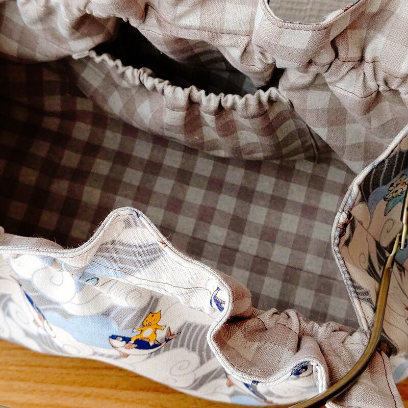 表布は綿麻でかわいい波乗り猫柄。底部は黒色デニムです。